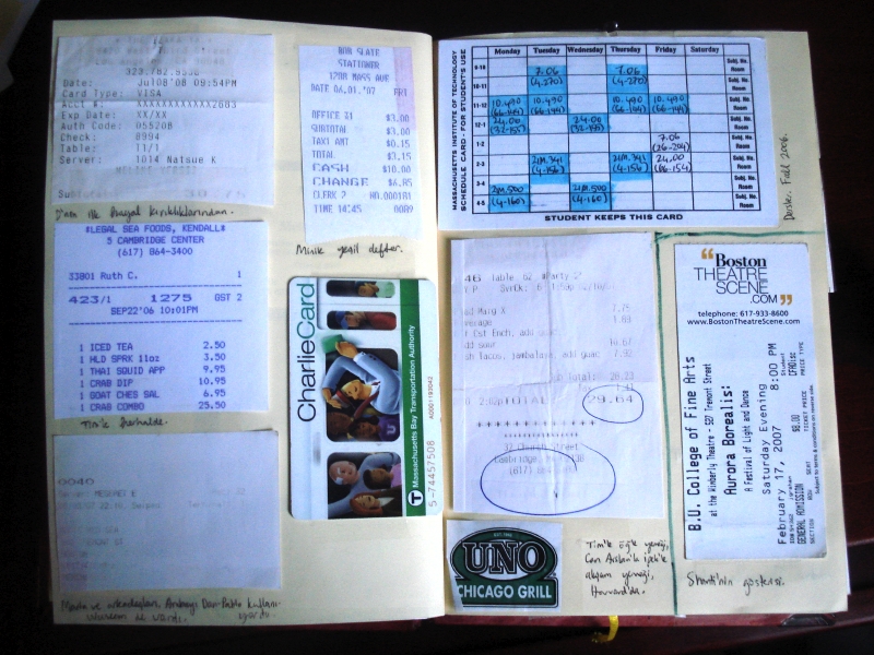Lise yıllarımda arkadaşlarla sinemaya gitmeye başladığım zaman bilet artıklarını öylesine saklamaya başlamıştım. Yıllar içinde bütün biletleri, önemli fişleri, ve diğer minik kağıt parçalarını bir kutuda muhafaza etme alışkanlığı edindim. Kutu küçük geldi, bir kutu daha aldım, ama bu da az geldi. Kalın, çizgisiz sayfalı ve kopçalı bir defter bu probleme en iyi çözümdü.